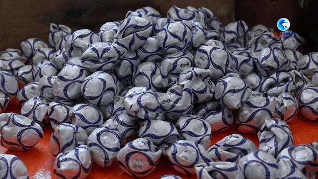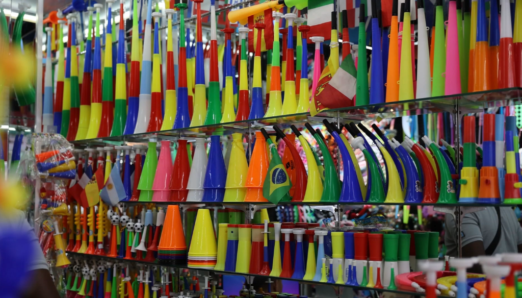 满载着喇叭、旗帜和足球等商品的集装箱卡车