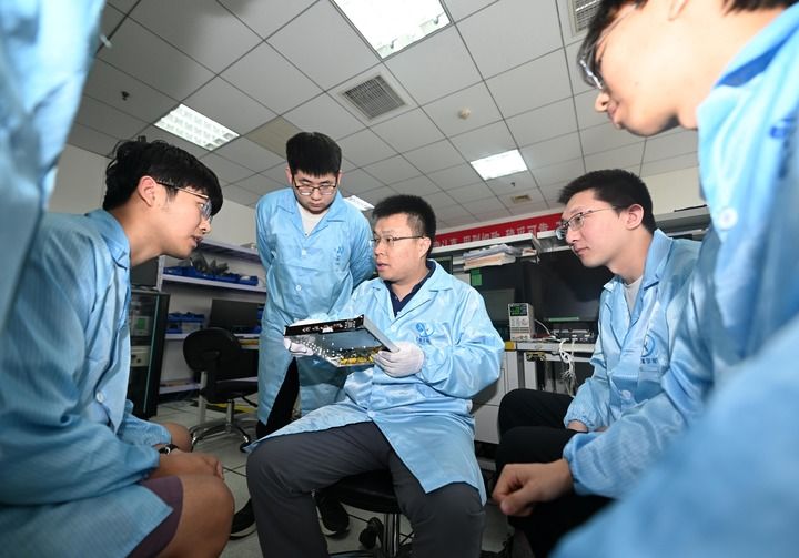 在云遥宇航的研发部,李峰辉(中)和团队成员讨论一款卫星核心部件的集成电路板(2024年6月4日摄)。新华社记者 赵子硕 摄