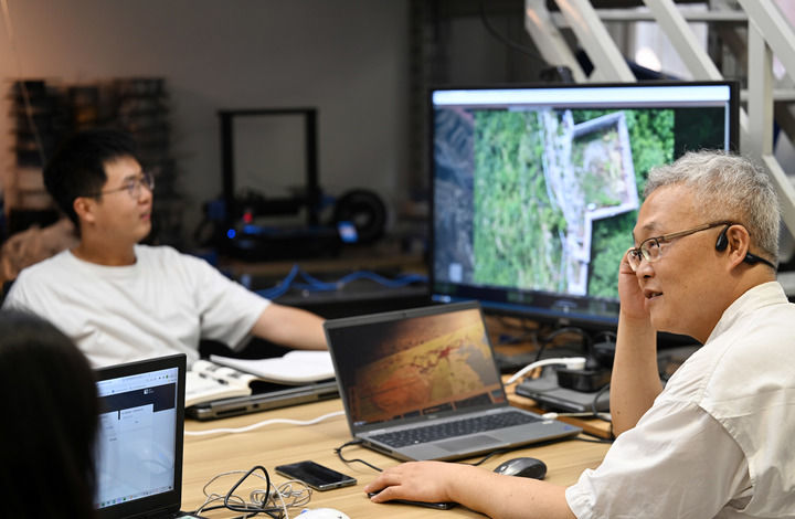 李哲(右)和学生在工作室内就拍摄的长城图像进行交流(2023年7月25日摄)。新华社记者 李然 摄