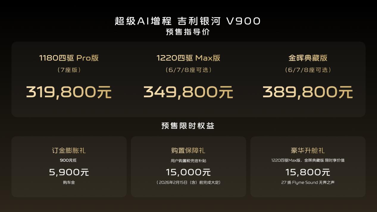 1月7日,吉利银河旗下V系列的首发之作,“AI全场景家庭旗舰MPV”——吉利银河V900正式开启预售,共计3个版本,预售指导价格区间为31.98万元-38.98万元。新车围绕用户出行的真实需求,以宽奢空间、豪华驾控、全维安全、AI智能几大全能满配实力,重新定义豪华旗舰MPV价值标准,树立AI全场景豪华出行新高度。