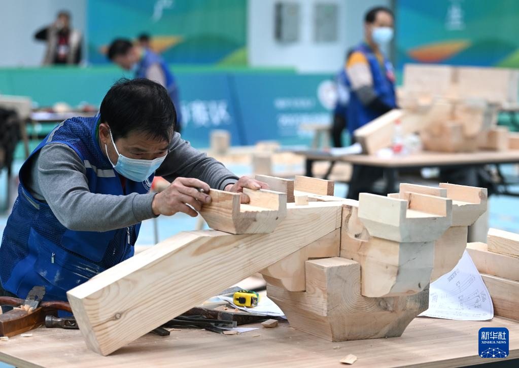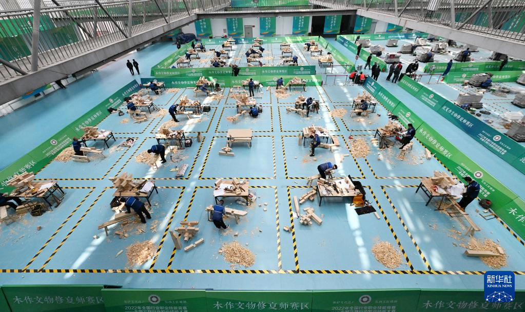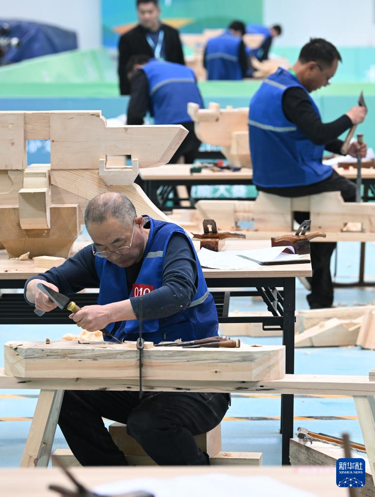 参赛选手在木作文物修复师比赛现场紧张竞技(3月25日摄)。