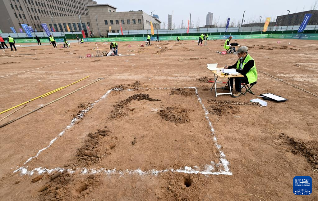 3月25日,参加考古探掘工比赛项目的选手在现场进行钻探。