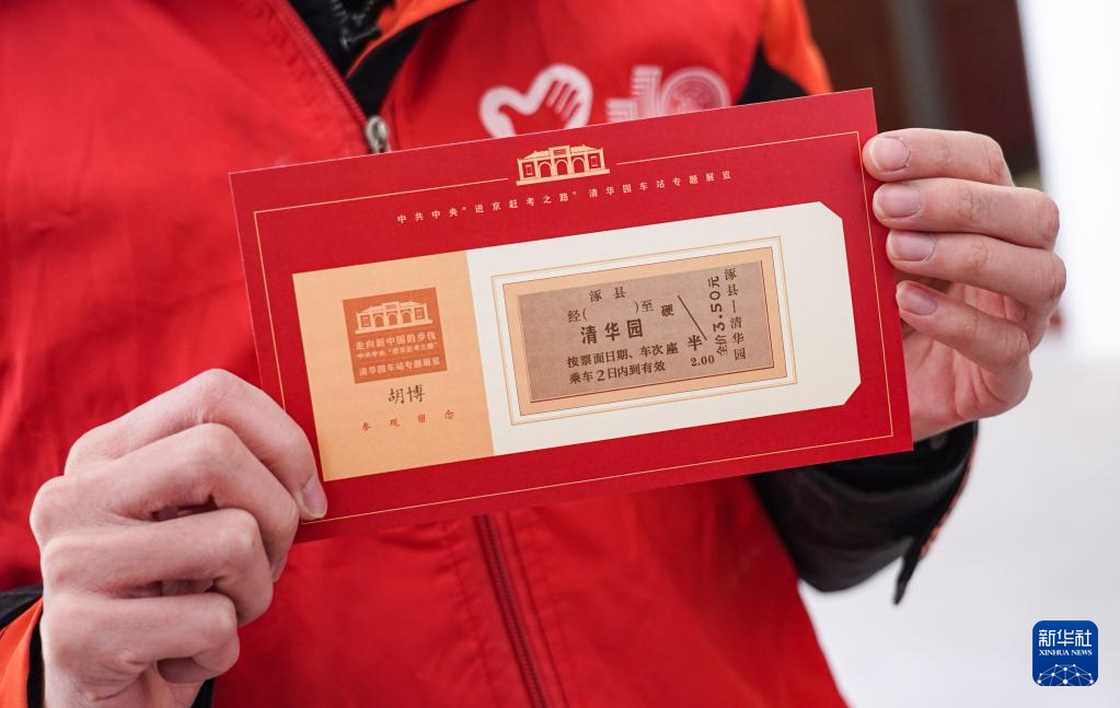 3月25日,在清华园车站旧址的专题展览厅内,一名志愿者展示印有“老车票”的纪念卡片。