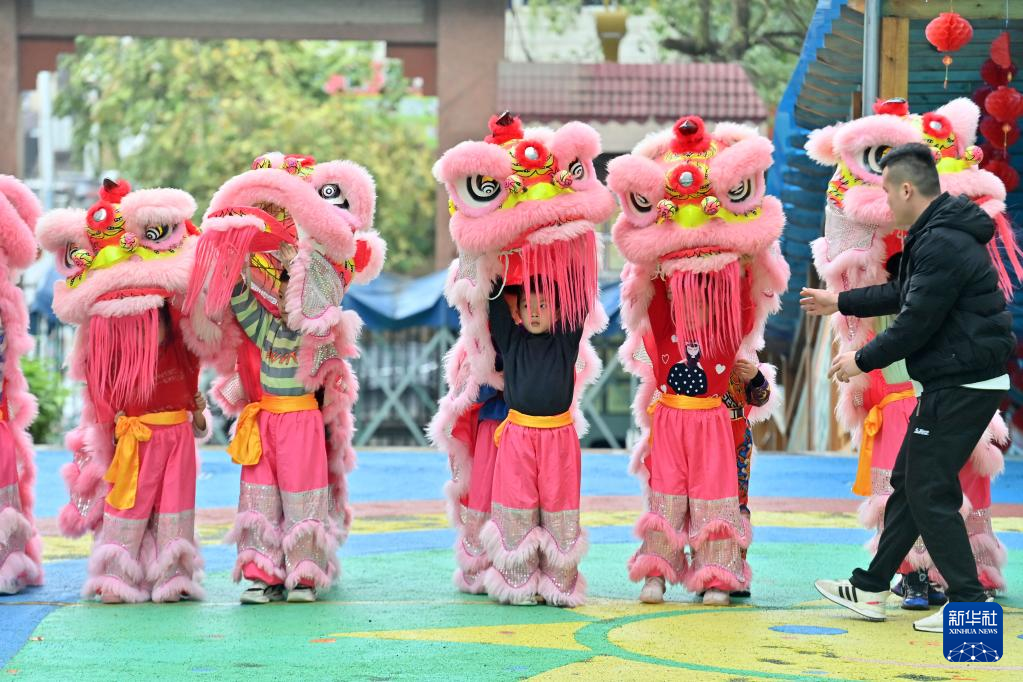 3月28日,在广西梧州市藤县第一幼儿园,小朋友们准备进行舞狮训练。