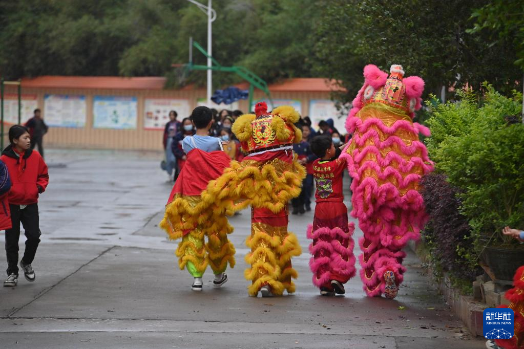 3月28日,在广西梧州市藤县潭津中心校,小学生们在舞狮训练结束后返回教室。