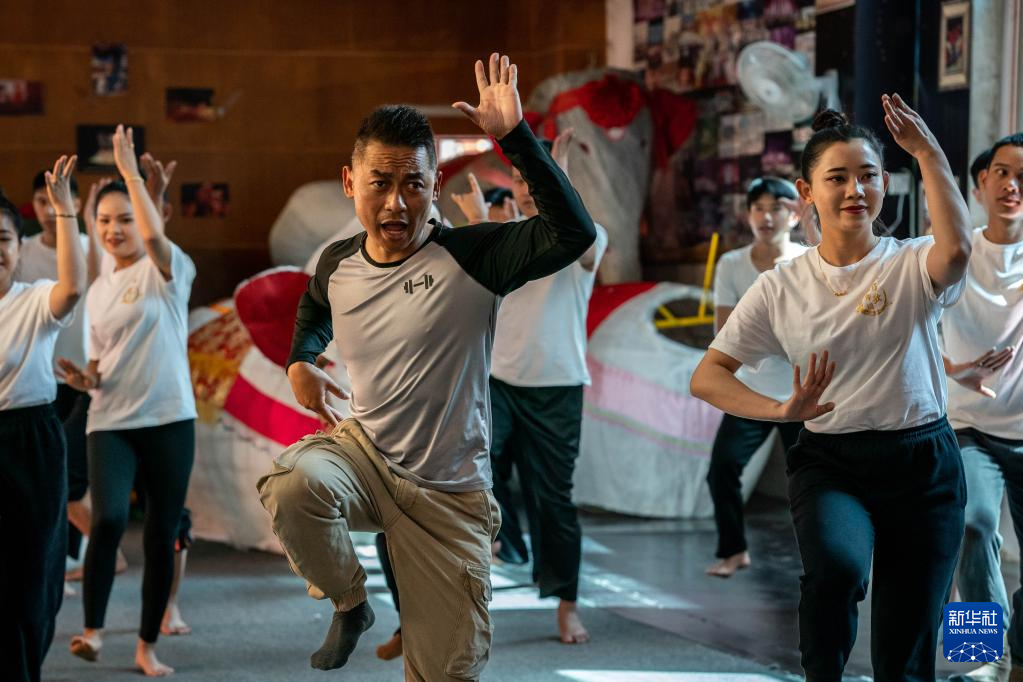 耿马县民族歌舞团团长王峰(右下)在和演员们交流舞蹈动作(3月23日摄)。