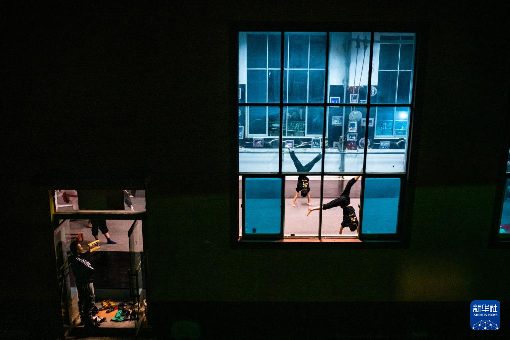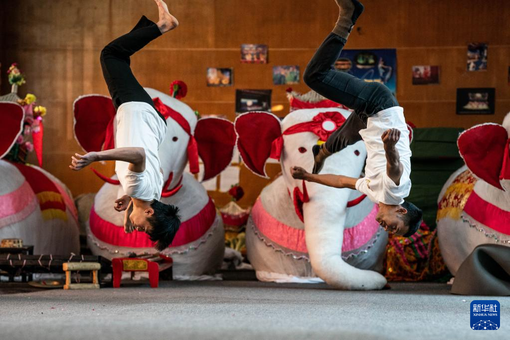 耿马县民族歌舞团演员岩平(左)、宰努思在练功房练习侧空翻(3月23日摄)。