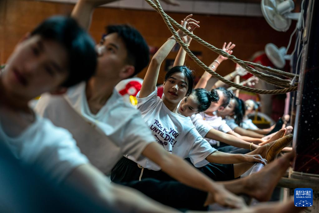 耿马县民族歌舞团团长王峰(前左)在练功房和演员们一起练习耿马傣族古乐舞(3月23日摄)。