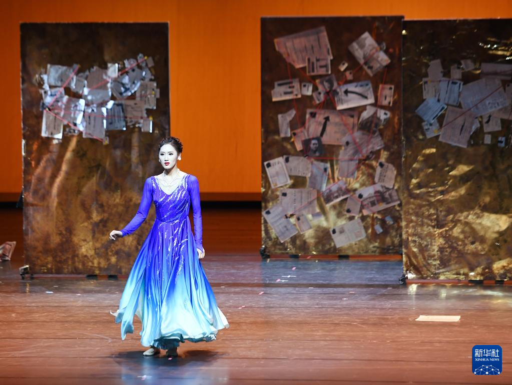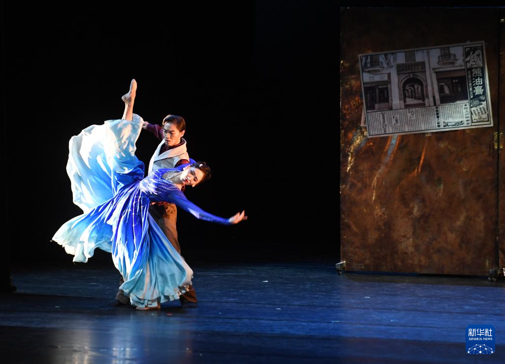 4月3日,演员在舞剧《蓝色裙摆》中表演。
