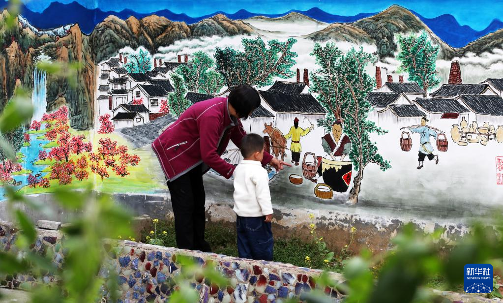 4月12日,在禹州市神垕古镇一家钧瓷企业,游客观看钧瓷制作技艺壁画。