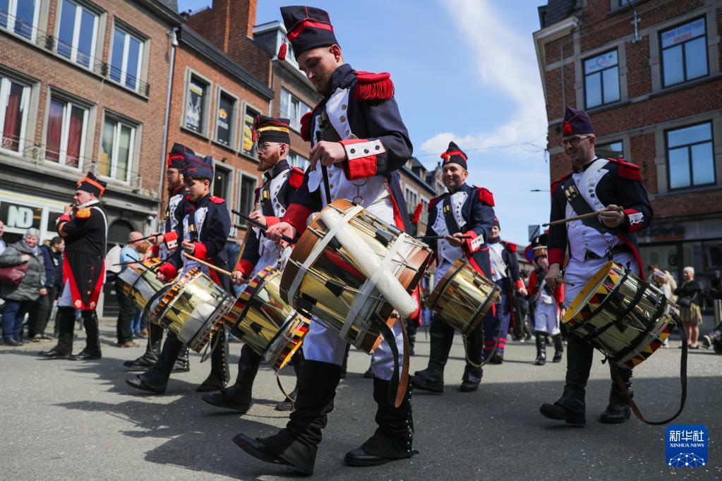 4月15日,身着古装的乐队在比利时那慕尔市传统民俗日活动上行进。