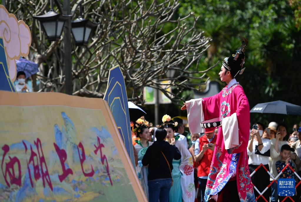 4月15日,在福州西湖上巳节启动仪式现场,福建闽剧院的演员在表演闽剧片段。