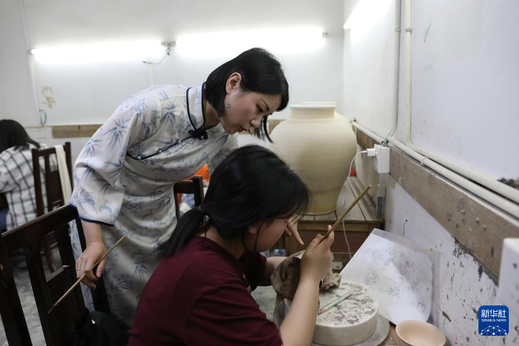 4月19日,在位于江西景德镇的“青花故事”创作基地,蔡文娟指导学徒绘制青花图案。