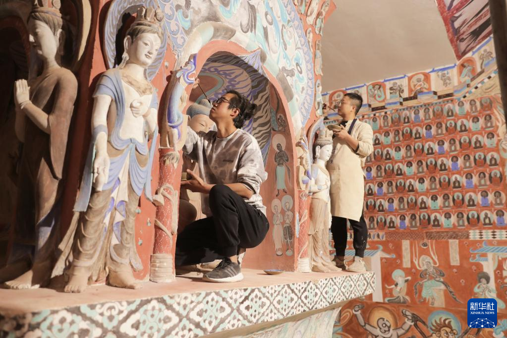 5月11日,在位于敦煌市的莫高里工匠村,学员为莫高窟复制窟进行彩绘。