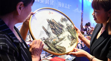 5月17日,浙江省诸暨市暨北幼儿园的孩子们在“夏趣文化节”上展示自己做的扎染手帕。