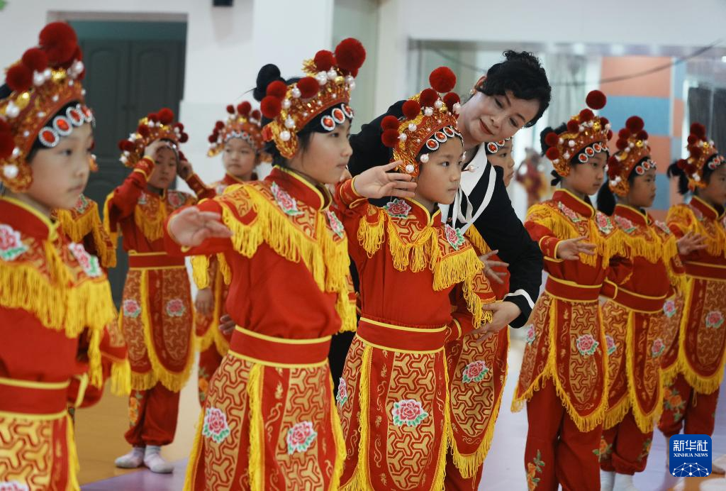 在江西省宜黄县水北新区小学,老师带领学生们排练六一儿童节的宜黄戏节目(5月25日摄)。