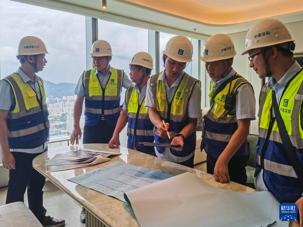 伍涛(中)和同事在350米高处的深湾汇云中心空中平台研究这里的空间装饰设计(无人机照片,6月26日摄)。