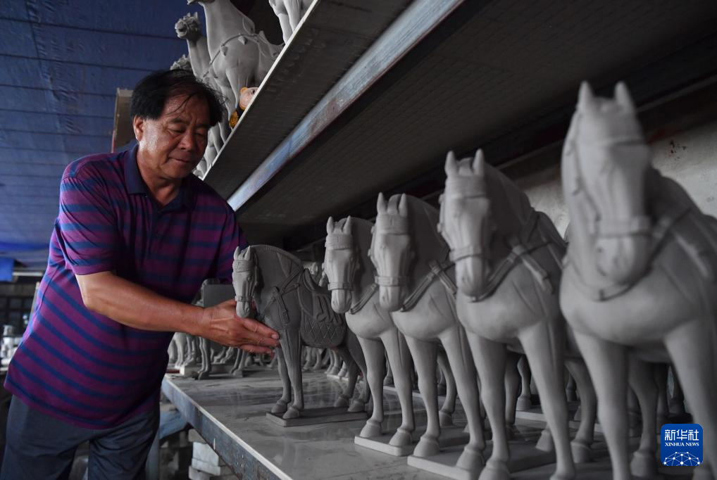 7月20日,在南石山村一家唐三彩生产企业的车间里,工人在加工泥胎。