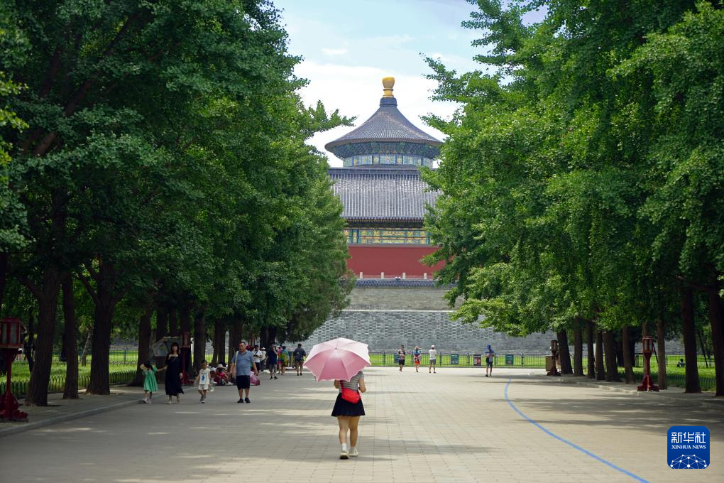 游客从天坛双环万寿亭前走过(7月10日摄)。天坛始建于明永乐十八年(1420年),是世界上现存规模最大、保存最完整的古代祭天建筑群,1998年被列入世界文化遗产名录。