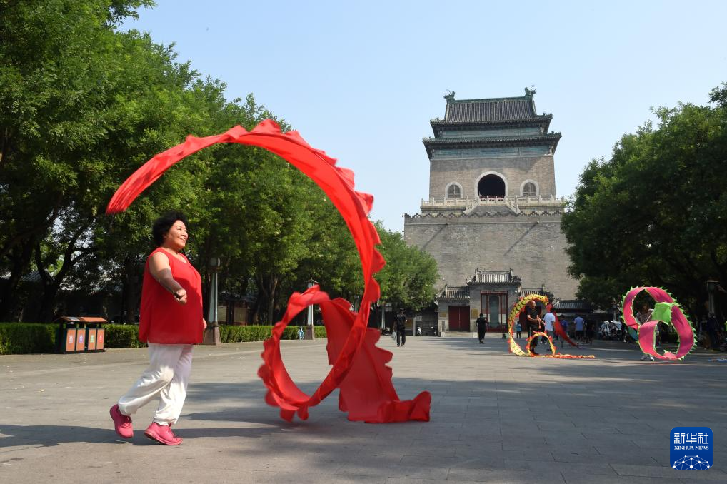 市民在北京钟楼前锻炼(7月18日摄)。钟鼓楼位于北京中轴线的最北端,两楼前后纵置,气势雄伟。作为元、明、清三代都城的报时中心,至今已有700多年的历史。
