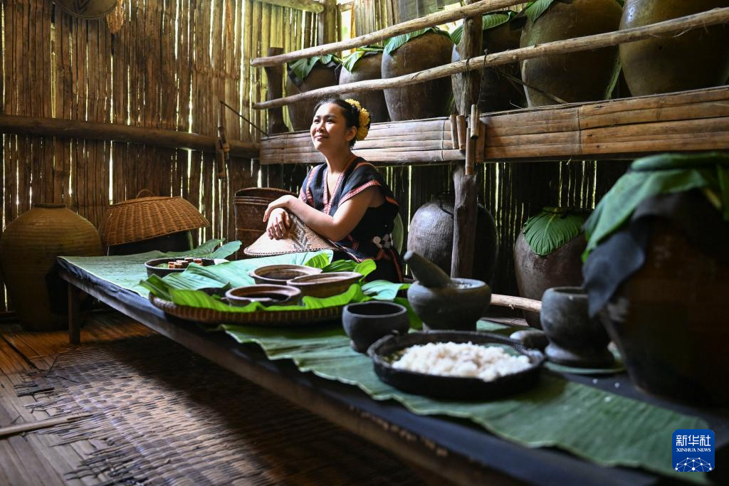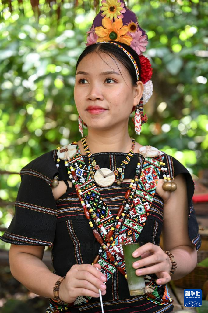 11月14日,在马来西亚沙巴州的马里马里文化村,一名身着传统民族服饰的女子制作糯米酒。