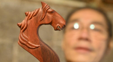 10月10日,黄一格在家中雕刻一把马骨胡的琴头。