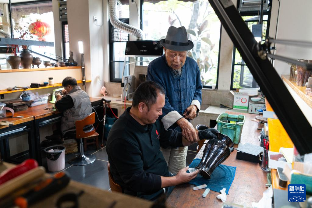 10月25日,在昆明乌铜走银传习馆,弟子在金永才指导下进行细打磨作业。