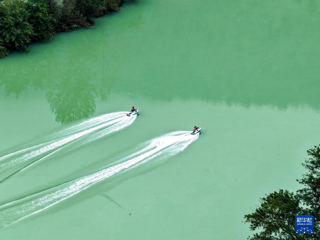 10月30日,水上运动爱好者在濯水古镇旁的阿蓬江上体验水上摩托艇(无人机照片)。