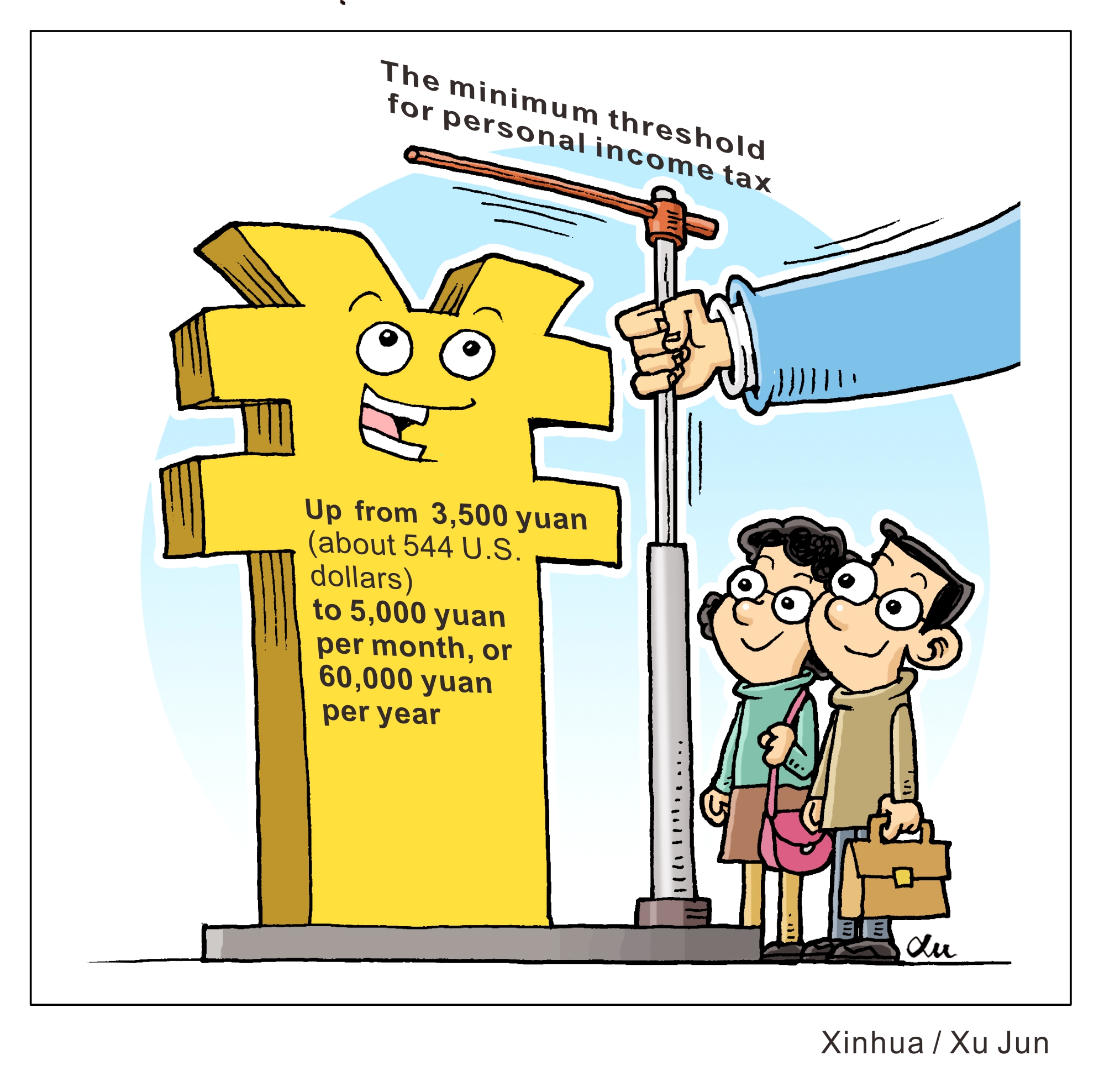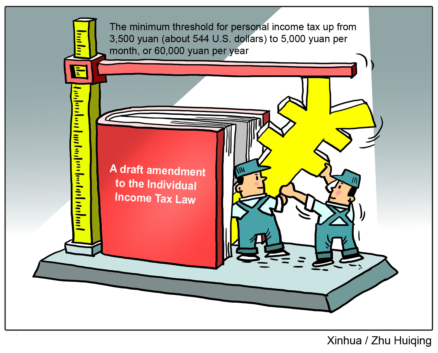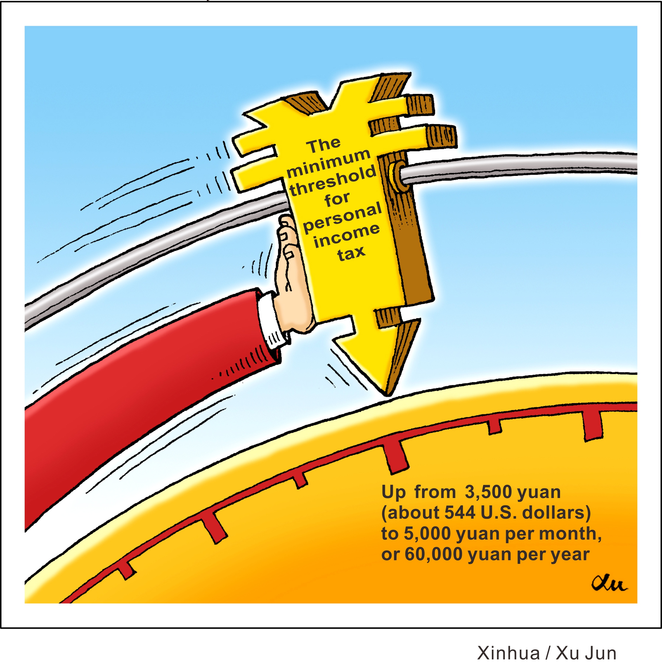 This cartoon shows that China will raise the minimum threshold for personal income tax from 3,500 yuan (about 544 U.S. dollars) to 5,000 yuan per month, or 60,000 yuan per year, as proposed by China's top legislature in a draft amendment to the Individual Income Tax Law on Tuesday. (Xinhua/Xu Jun/Shi Manke)