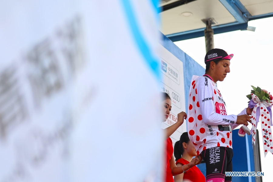 Hernan Aguirre from Manzana Postobon celebrates with the polka-dot jersey at the award ceremony of the twelfth stage of the Tour of Qinghai Lake in Yinchuan, northwest China's Ningxia Hui Autonomous Region, on August 3, 2018. (Xinhuanet Photo by Jia Haiyuan)