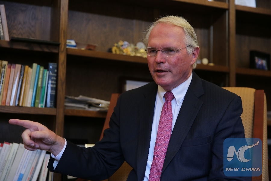 Former senior U.S. diplomat Christopher Hill receives an exclusive interview with Xinhua in Denver, the United States, Nov. 1, 2018. (Xinhua/Guo Yina)