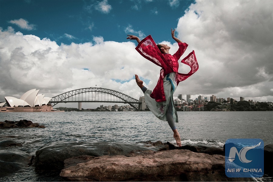 This photo exhibited at the exihibition shows a Chinese dancer with the Sydney Opera House and Harbor Bridge in the background. (Photo courtesy of organizer)