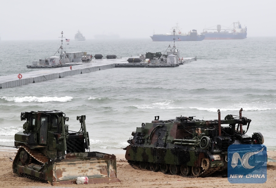 Photo taken on April 11, 2017 shows military vehicles during the U.S.-South Korea joint Exercise Operation Pacific Reach in Pohang, South Korea. (Xinhua/Lee Sang-ho)