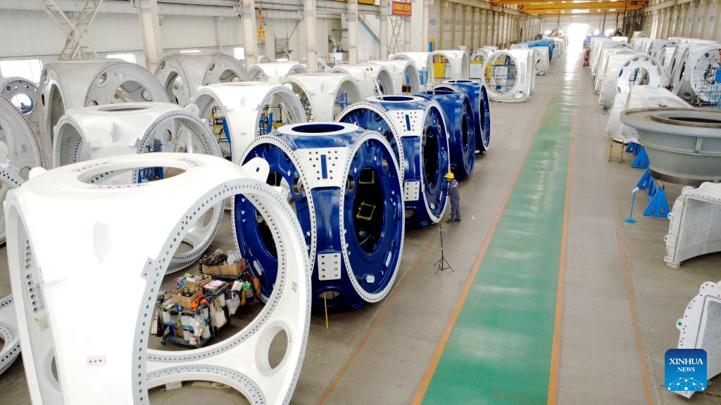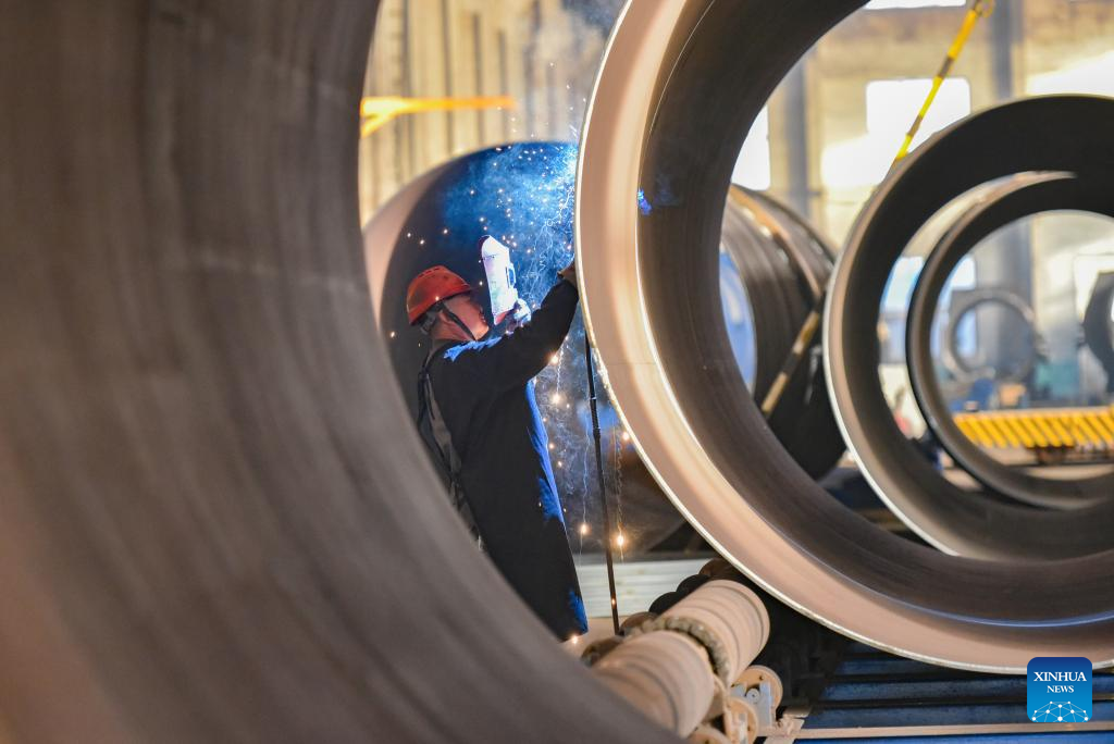 An employee conducts welding work at a wind power equipment manufacturing company in Qingzhou, east China's Shandong Province, Dec. 15, 2025. (Photo by Wang Jilin/Xinhua)