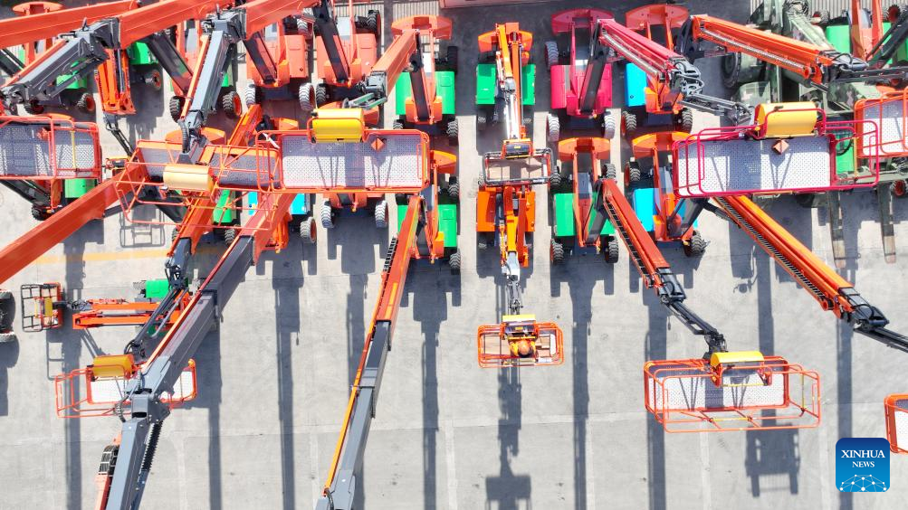 An aerial drone photo taken on Dec. 15, 2025 shows staff members examining intelligent aerial work platforms for export at a machinery company in Leidian Town, Huzhou, east China's Zhejiang Province. (Photo by Xie Shangguo/Xinhua)