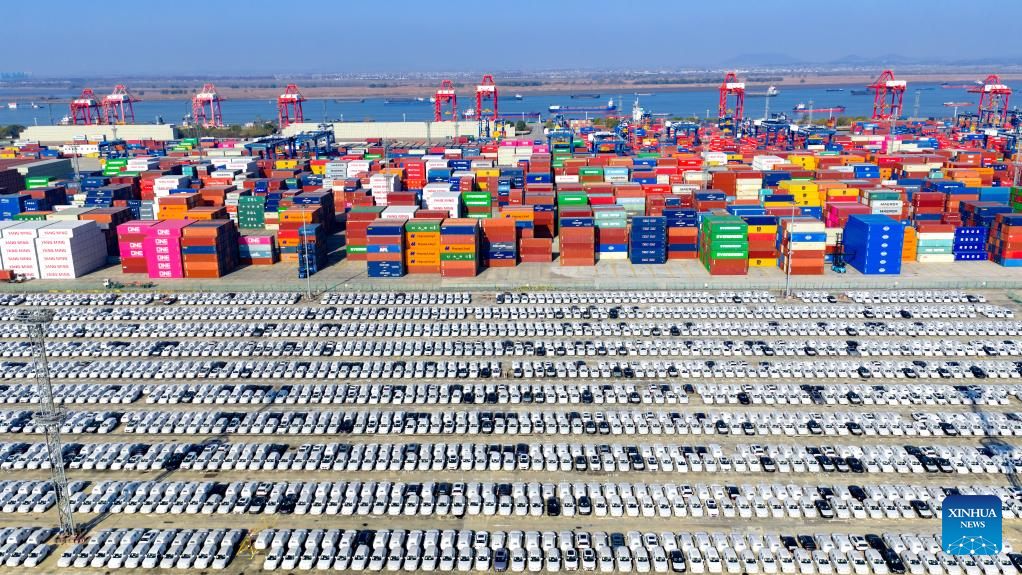 An aerial drone photo taken on Dec. 14, 2025 Chinese-made vehicles waiting for export at a container dock of Nanjing Port in Nanjing, east China's Jiangsu Province. (Photo by Yang Suping/Xinhua)