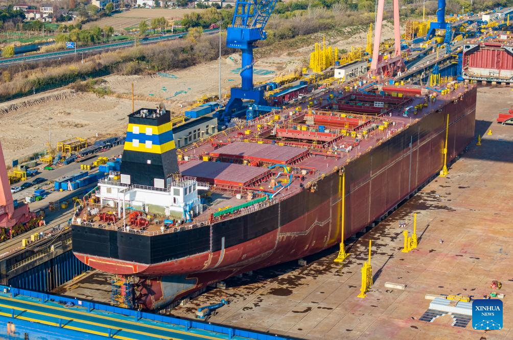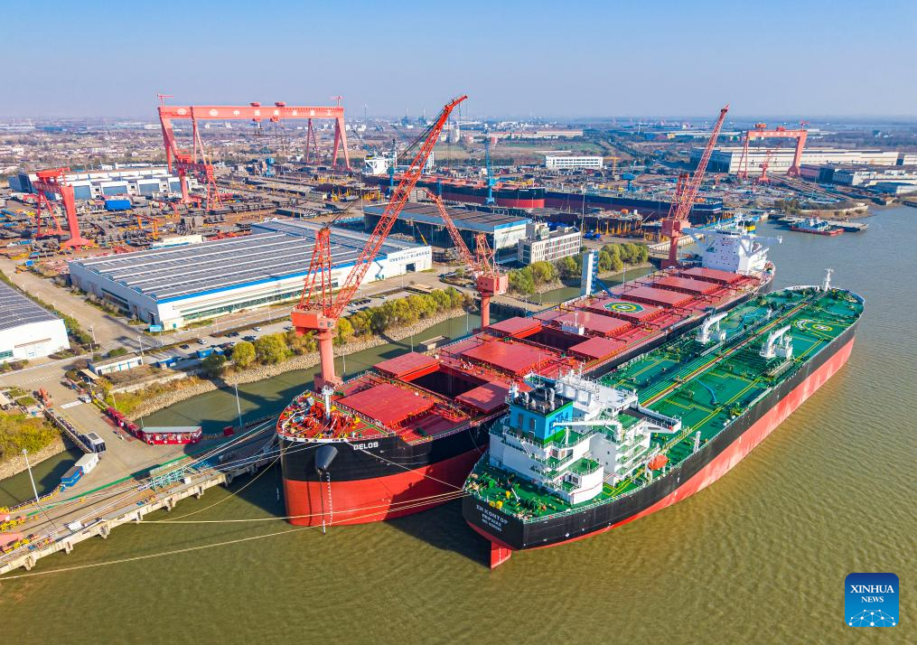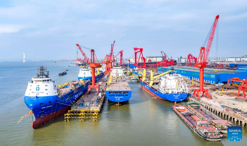 An aerial drone photo taken on Dec. 15, 2025 shows vessels under construction at a shipbuilding company in Taizhou, east China's Jiangsu Province. (Photo by Zhou Shegen/Xinhua)