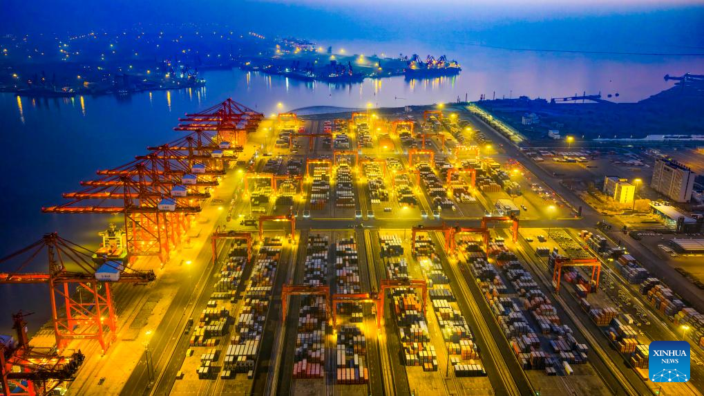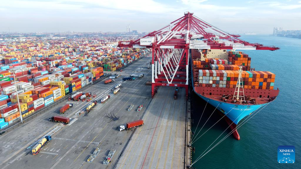 An aerial drone photo taken on Dec. 15, 2025 shows a cargo ship loading and unloading containers at Qingdao Port in Qingdao, east China's Shandong Province. (Photo by Yu Fangping/Xinhua)