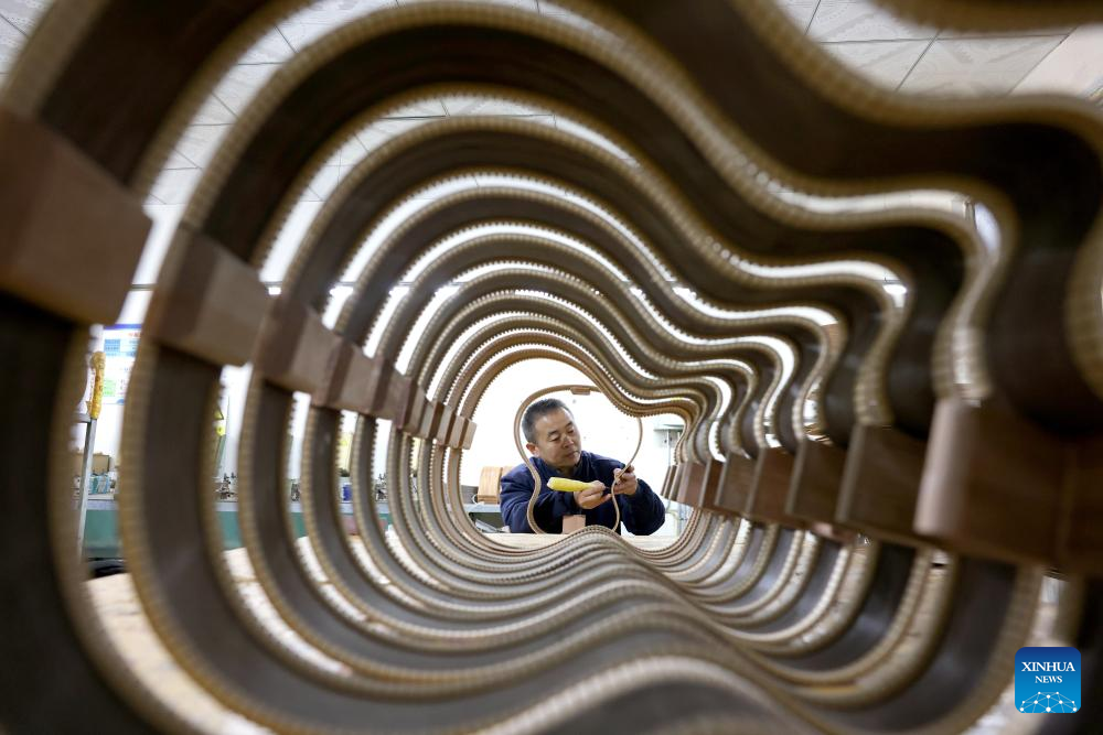 A worker makes guitar at a guitar company in Mengzhuang Town of Zaozhuang, east China's Shandong Province, Dec. 15, 2025. (Photo by Sun Zhongzhe/Xinhua)