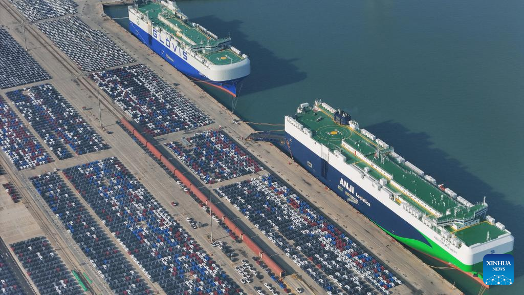 An aerial drone photo taken on Dec. 15, 2025 shows Chinese-made vehicles waiting for export in Yantai Port of Yantai, east China's Shandong Province. (Photo by Tang Ke/Xinhua)