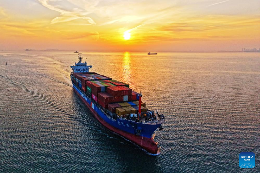 An aerial drone photo taken on Dec. 15, 2025 shows a container vessel sailing into Yantai Port in Yantai, east China's Shandong Province. (Photo by Sun Wentan/Xinhua)