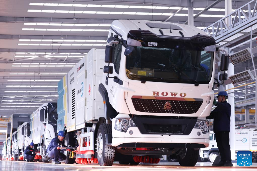 Workers assemble a new energy sanitation vehicle at a company in Shijiazhuang, north China's Hebei Province, Dec. 15, 2025. (Photo by Liang Zidong/Xinhua)