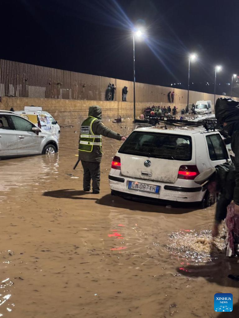 In the southern province of Tinghir, four people were killed after their vehicle was swept away by strong currents and overturned into a river between the areas of Fezou and El Hafira, local news outlet Hibapress reported. (Photo by Saouri Aissa/Xinhua)