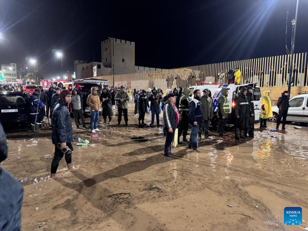 Rescuers from the local security and civil defense department work in a flood-hit area in Safi province, Morocco, Dec. 14, 2025. At least 41 people were killed in flash floods caused by heavy rainfall in Morocco on Sunday, authorities said on Monday. In the Atlantic coastal province of Safi, local authorities said in a statement that the death toll had risen to 37, with 14 injured people receiving treatment at local hospitals. In the southern province of Tinghir, four people were killed after their vehicle was swept away by strong currents and overturned into a river between the areas of Fezou and El Hafira, local news outlet Hibapress reported. (Photo by Saouri Aissa/Xinhua)