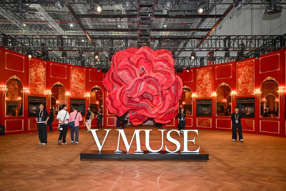 11月5日,观众在第八届进博会消费品展区VMUSE珠宝展台参观。