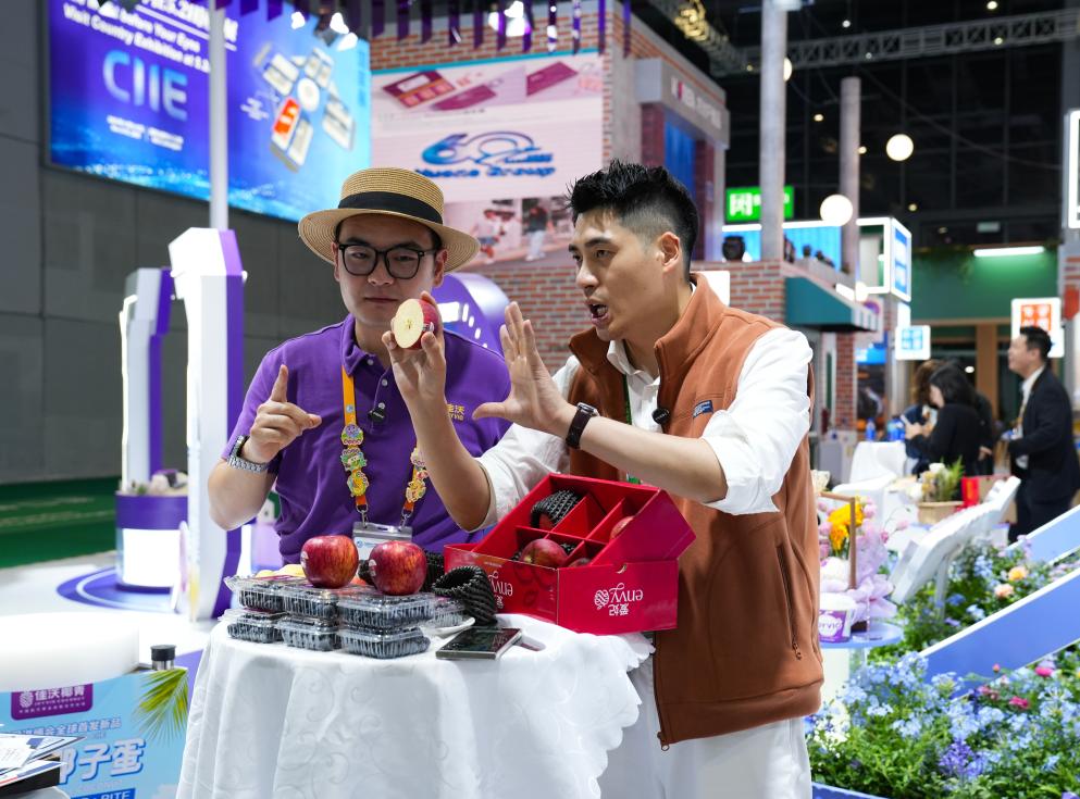 11月5日,在第八届进博会农食产品展区,参展商(左)为观众介绍口腔护理产品。