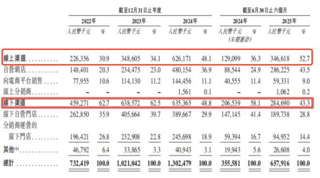 招股书显示,2022年-2025年上半年,坦博尔线上渠道销售收入分别为2.26亿元、3.49亿元、6.26亿元、3.47亿元。2025年上半年,线上渠道销售收入首次超过线下渠道,占总收入比例达到52.7%。其中,线上自营门店表现突出,2024年营收4.80亿元,占总营收36.9%,较2022年增长223.6%。