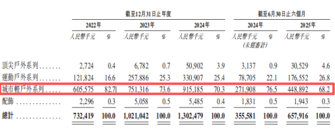产品方面,坦博尔将其分为顶尖户外系列、运动户外系列与城市轻户外三大系列,其中,城市轻户外系列作为主力,2022年-2024年收入分别为6.05亿元、7.51亿元、9.15亿元,占比82.71%、73.6%、70.3%。