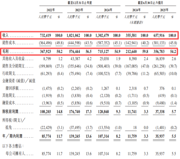 转型成效也十分明显。招股书显示,2022年-2025年上半年,坦博尔分别实现收入7.32亿元、10.21亿元、13.02亿元、6.58亿元,毛利为3.68亿元、5.76亿元、7.15亿元、3.57亿元,利润为0.86亿元、1.39亿元、1.07亿元、0.36亿元。