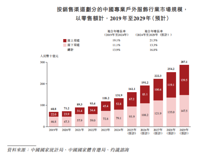 近年来,在健康意识和户外运动基础设备不断完善的背景下,中国户外运动市场快速发展。据灼识咨询数据,中国专业户外服饰行业市场规模由2019年的688亿元增长至2024年的1319亿元,预计2029年将达到2871亿元。本土专业户外服饰品牌市场规模也由2019年的270亿元增长至2024年的573亿元,预计到2029年将达到人民币1372亿元。